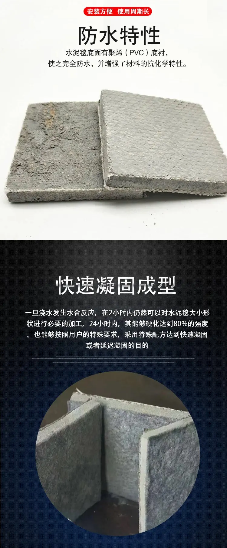 4. 快速固化:水泥毯遇到水后能够迅速发生化学反应,形成坚固的混凝土结构,大大缩短了施工时间。